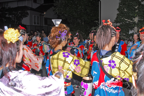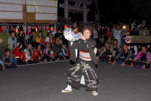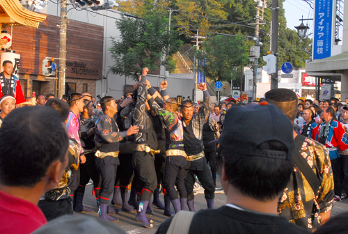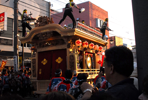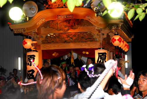 紅い夕日に、輝く 原区の山車。 本部前を去る。 |
