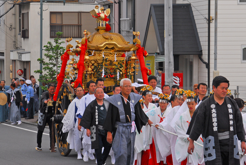 例祭は、御所車の神輿が氏子町内を巡行する。