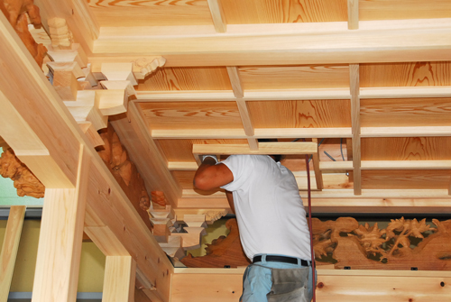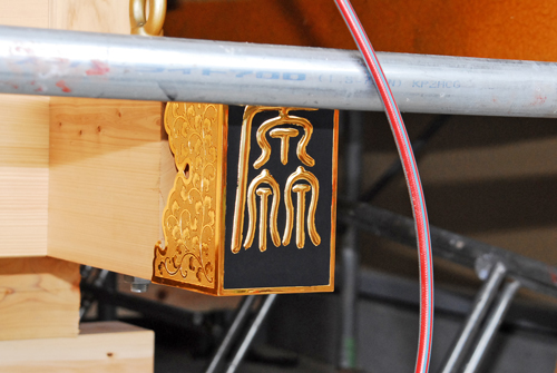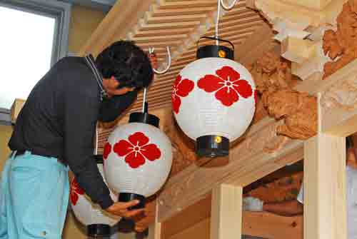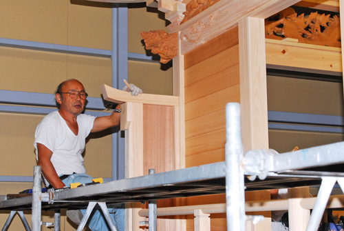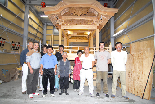 本体右側の羽目板、脇障子 の取り付けも済み、山車本体建築の 匠 SUZUKI氏の仕事は ここに完成した。 最近でこそ涼しくなったが、 酷暑のなか、朝早くから夕方 遅くまで、見事な仕事をしたお礼の言葉 としては意を尽くしていないが 「ほんとうに ごくろうさまでした。」 と申し上げたい。 後片付けを手伝った、は組若衆、ご近所の 方方と一緒に撮影した。 H18.10.6 PM5:00 大唐破風への鬼板彫刻の取り付け、 木口への装飾金具の取り付け等々、 もう暫く写真掲載をしていきたい。 |